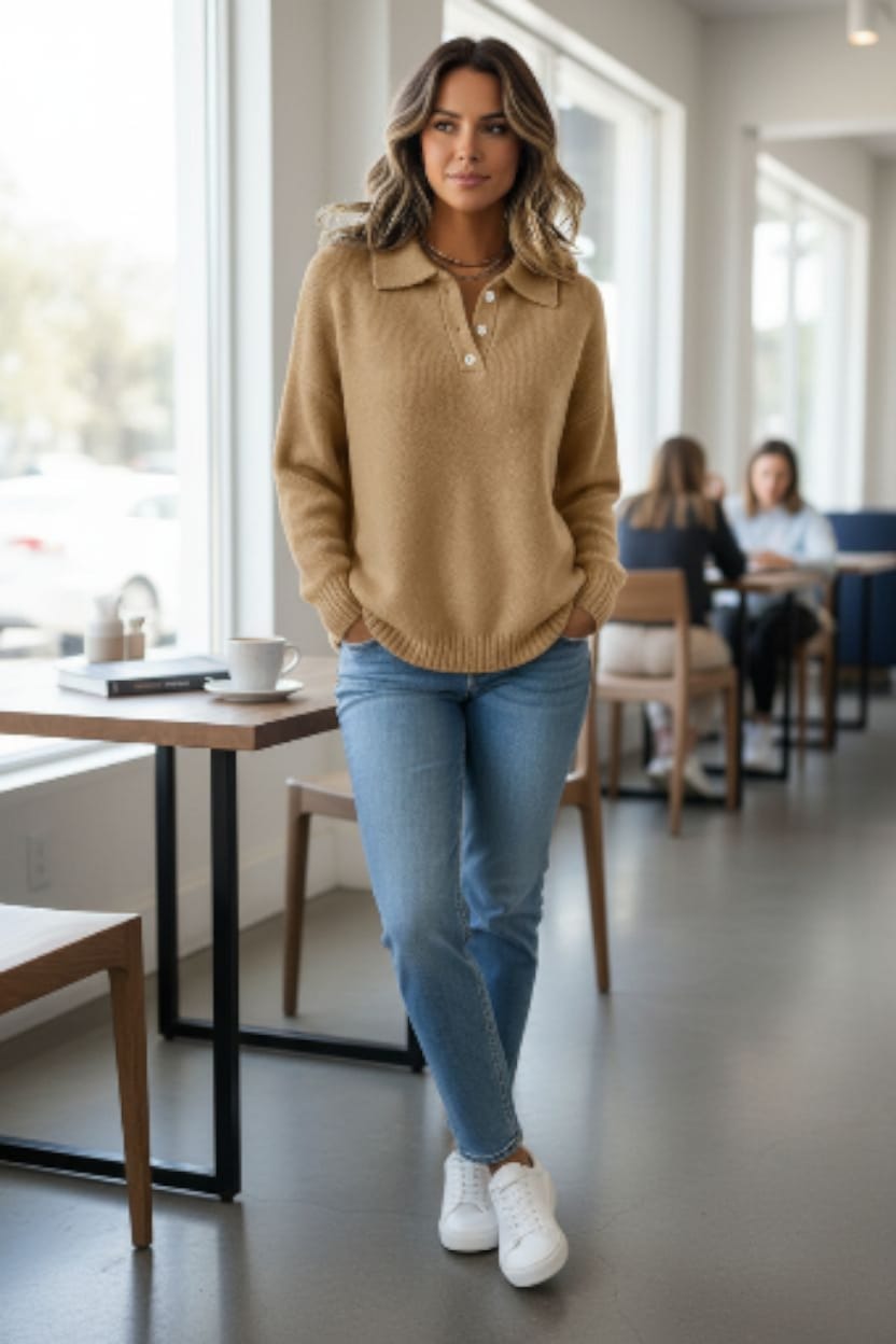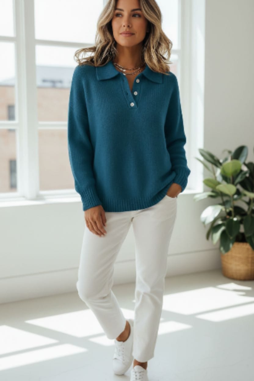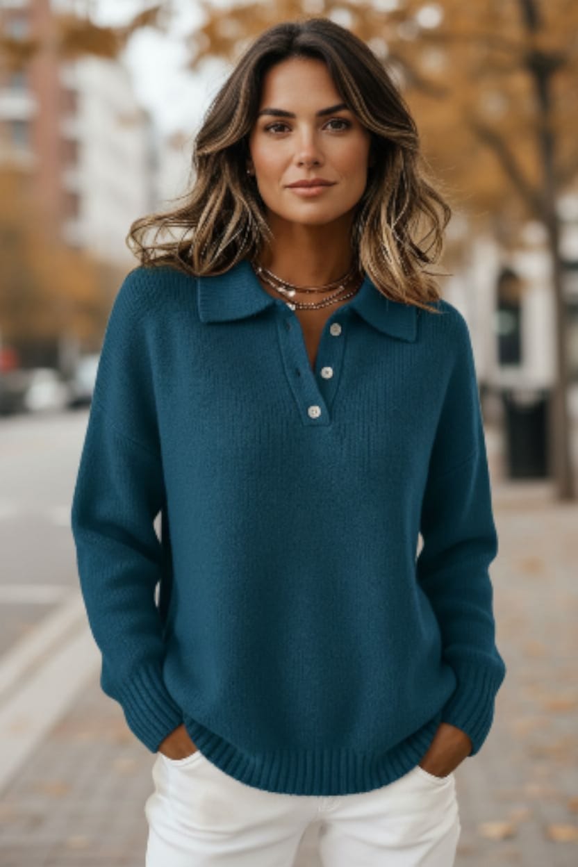 Eleva istantaneamente il tuo stile con Natalie, il maglione che unisce comfort impeccabile e raffinatezza senza sforzo. Ispirato alla classica polo, ma ripensato in un tessuto morbido ed elasticizzato, dona una vestibilità che valorizza e accompagna ogni movimento.