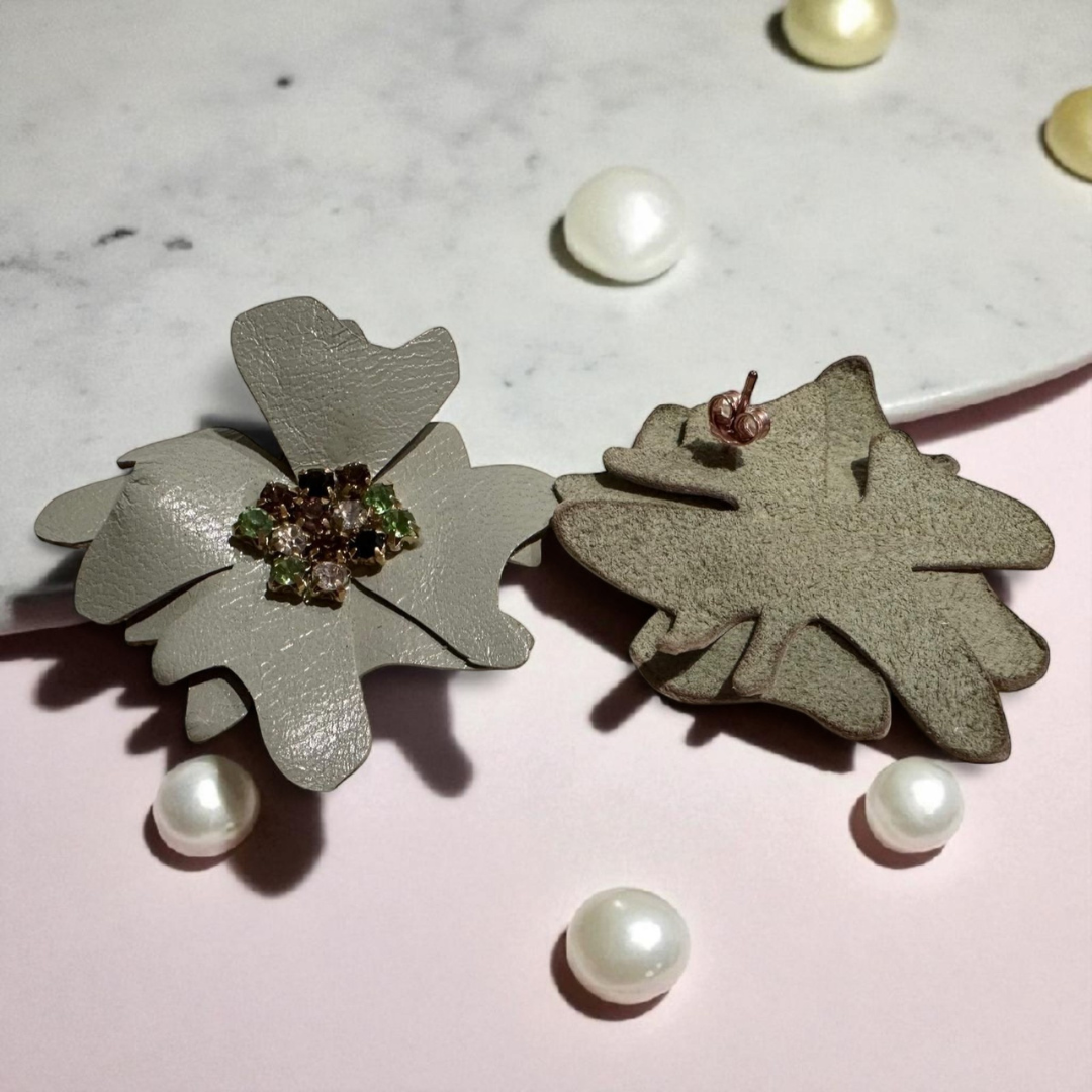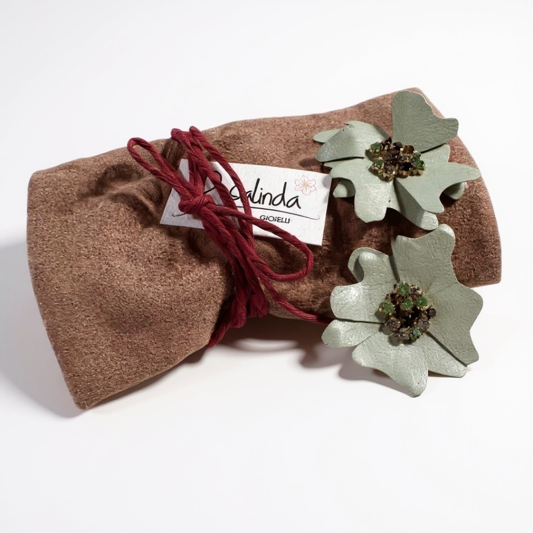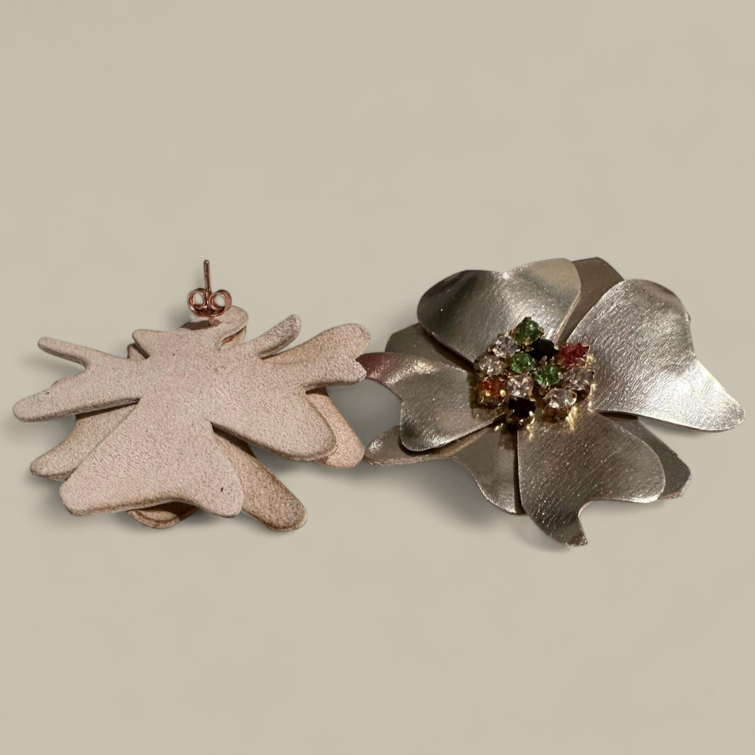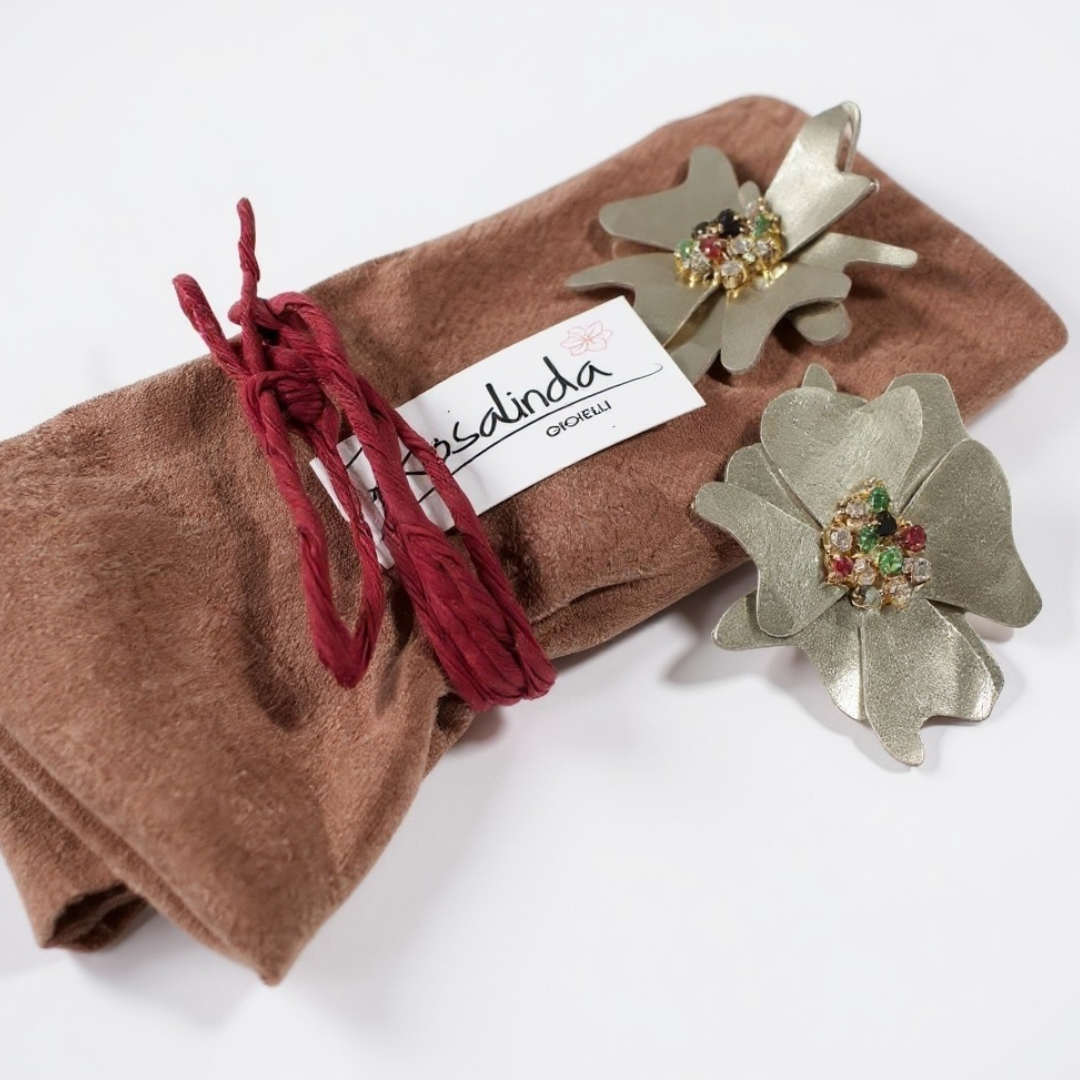 Eleganti orecchini a forma di fiore, realizzati a mano con pelle di recupero, per unire creatività e rispetto per l’ambiente. Ogni paio è impreziosito da strass colorati e montato su chiusure in Argento 925, per una finitura raffinata e di qualità.