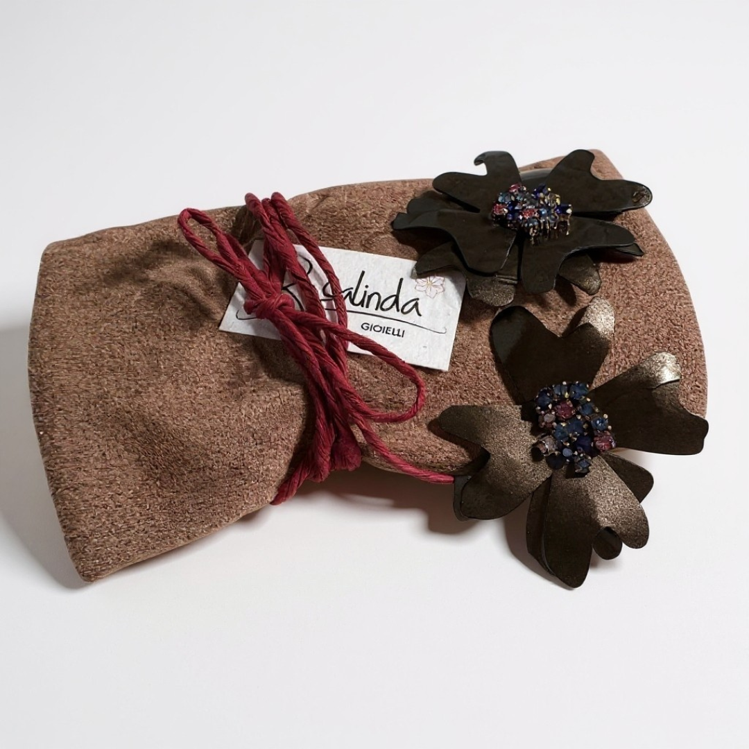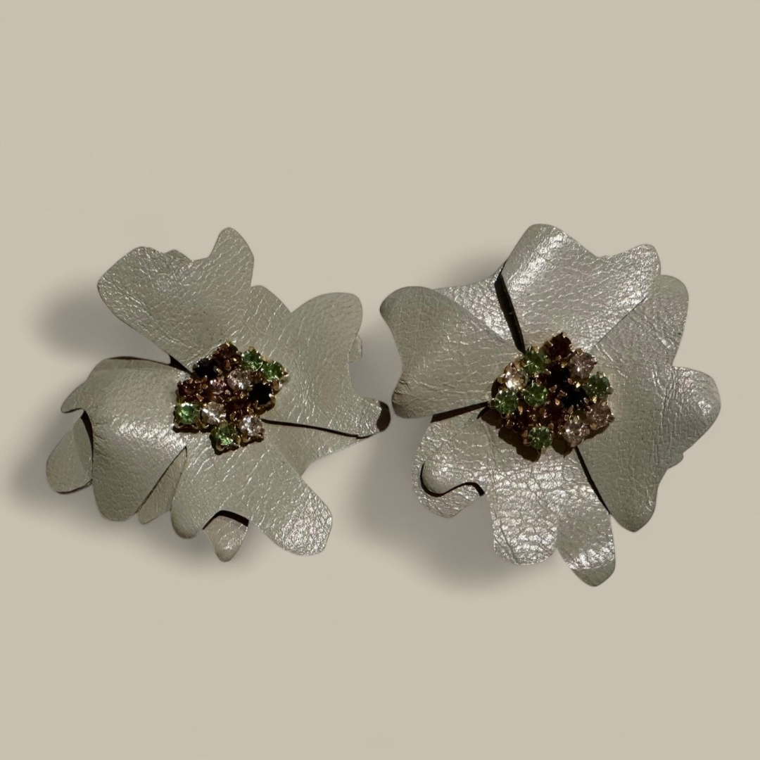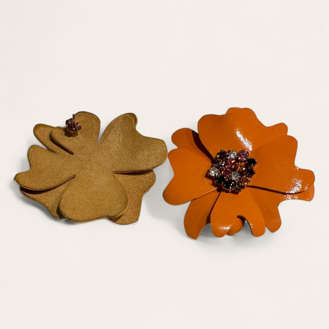 Eleganti orecchini a forma di fiore, realizzati a mano con pelle di recupero, per unire creatività e rispetto per l’ambiente. Ogni paio è impreziosito da strass colorati e montato su chiusure in Argento 925, per una finitura raffinata e di qualità.