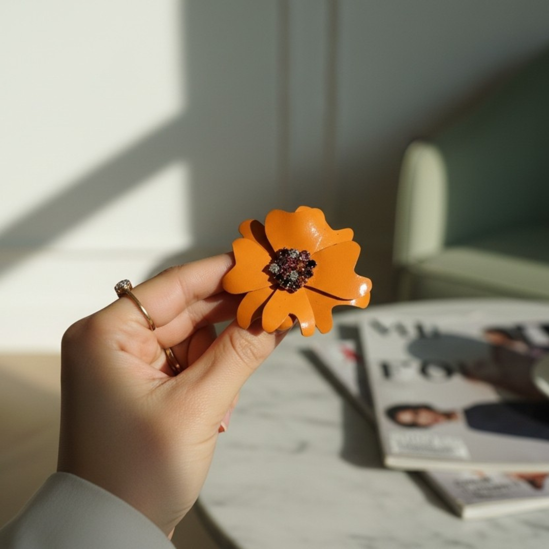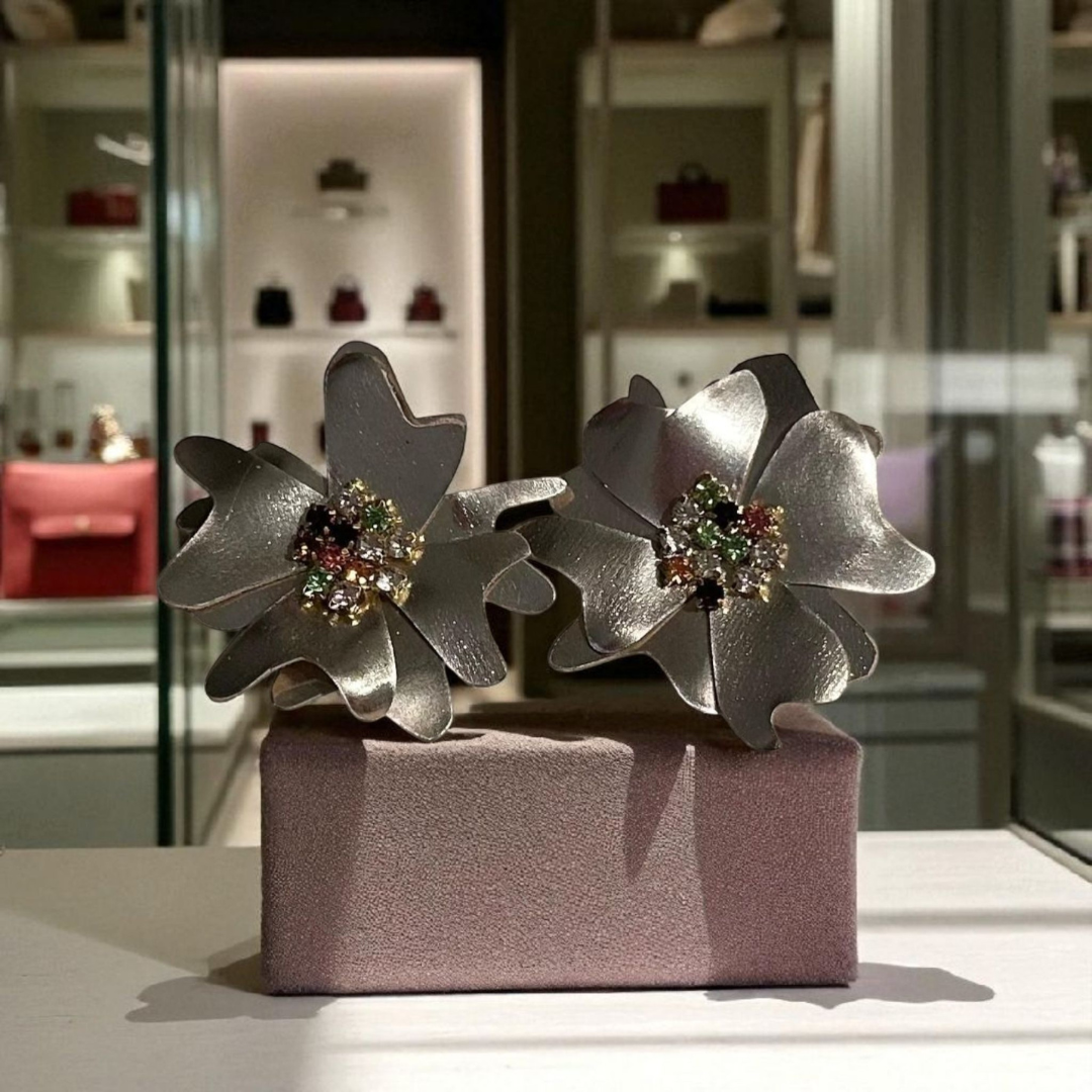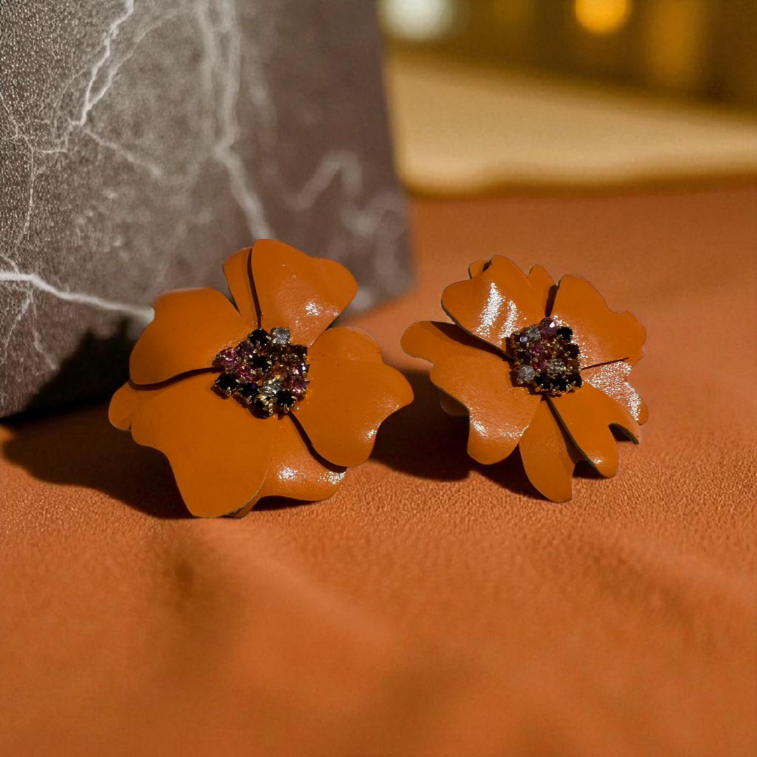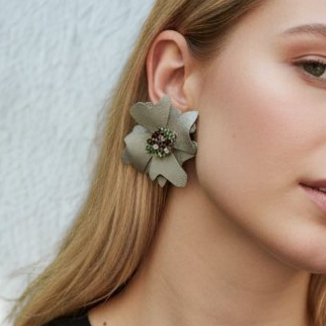 Eleganti orecchini a forma di fiore, realizzati a mano con pelle di recupero, per unire creatività e rispetto per l’ambiente. Ogni paio è impreziosito da strass colorati e montato su chiusure in Argento 925, per una finitura raffinata e di qualità.